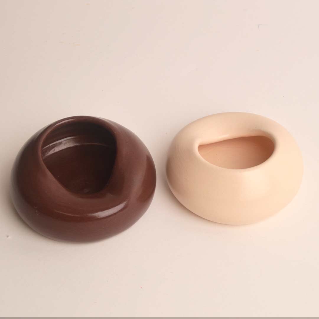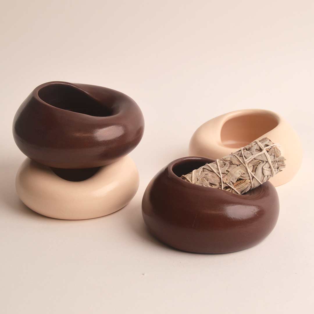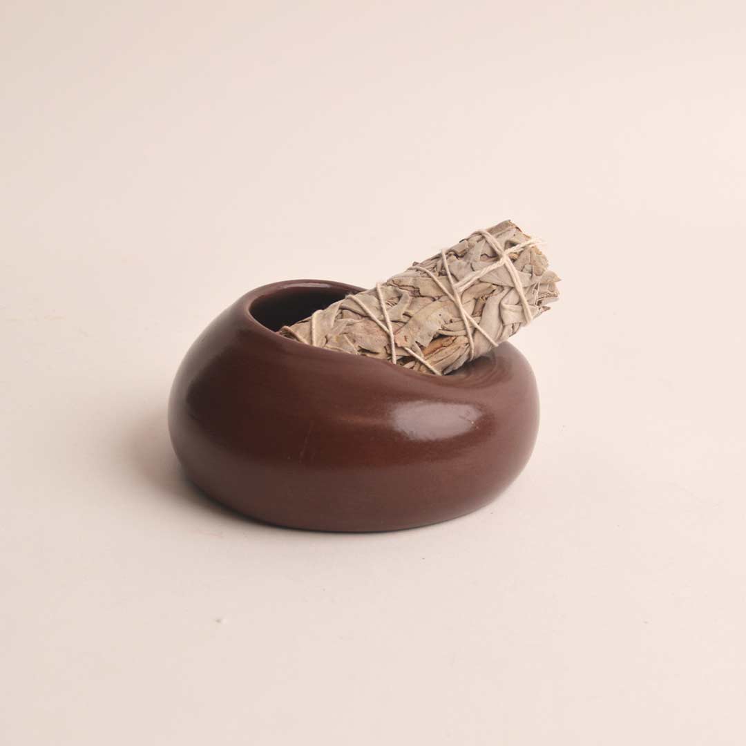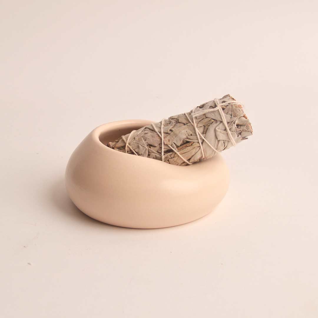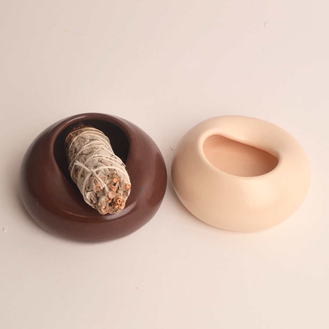 Pieza realizada a mano en el torno alfarero, modelada cuidadosamente para crear una forma orgánica, suave y equilibrada. Su diseño redondeado con cavidad interior la convierte en un soporte ideal para posar palo santo, atados de salvia u otras hierbas aromáticas durante su uso.